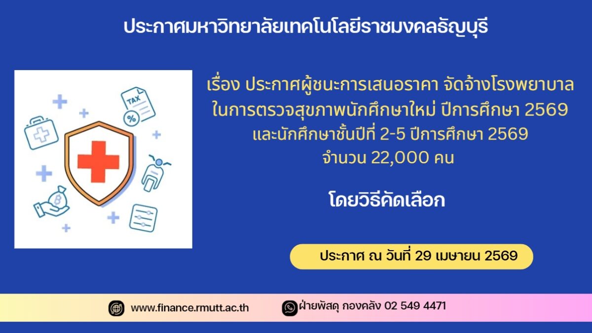 ตามที่ มหาวิทยาลัยเทคโนโลยีราชมงคลธัญบุรี ได้มีหนังสือเชิญชวนสำหรับ จัดจ้างโรงพยาบาลในการตรวจสุขภาพนักศึกษาใหม่ ปีการศึกษา 2569 และนักศึกษาชั้นปีที่ 2-5 ปีการศึกษา 2569 จำนวน 22,000 คน โดยวิธีคัดเลือก นั้น