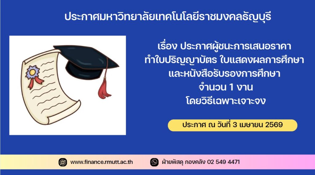 ตามที่ มหาวิทยาลัยเทคโนโลยีราชมงคลธัญบุรี ได้มีโครงการ จ้างทำใบปริญญาบัตร ใบแสดงผลการศึกษา และหนังสือรับรองการศึกษา จำนวน 1 งาน โดยวิธีเฉพาะเจาะจง นั้น