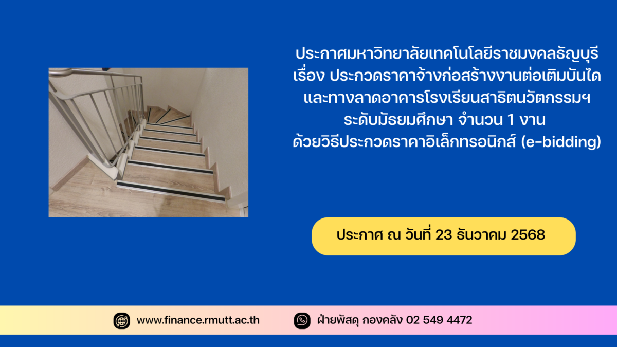 มหาวิทยาลัยเทคโนโลยีราชมงคลธัญบุรี มีความประสงค์จะประกวดราคาจ้างก่อสร้าง รายการ งานต่อเติมบันไดและทางลาดอาคารโรงเรียนสาธิตนวัตกรรมฯ ระดับมัธยมศึกษา จำนวน 1 งาน ด้วยวิธีประกวดราคาอิเล็กทรอนิกส์ (e-bidding) ราคากลางของงานจ้างก่อสร้าง ในการประกวดราคาครั้งนี้ เป็นเงินทั้งสิ้น 1,776,870.45 บาท (หนึ่งล้านเจ็ดแสนเจ็ดหมื่นหกพันแปดร้อยเจ็ดสิบบาทสี่สิบห้าสตางค์) จำนวน 1 รายการ