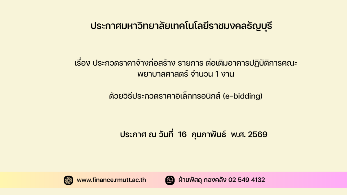 เลขที่ งรด.(จ) ๕/๒๕๖๙ ลงวันที่ ๑๖ กุมภาพันธ์ พ.ศ. ๒๕๖๙ผ่านทางระบบจัดซื้อจัดจ้างภาครัฐด้วยอิเล็กทรอนิกส์ ได้ตั้งแต่วันที่ประกาศจนถึงวันเสนอราคา ได้ที่เว็บไซต์ www.finance.rmutt.ac.thหรือwww.gprocurement.go.th
