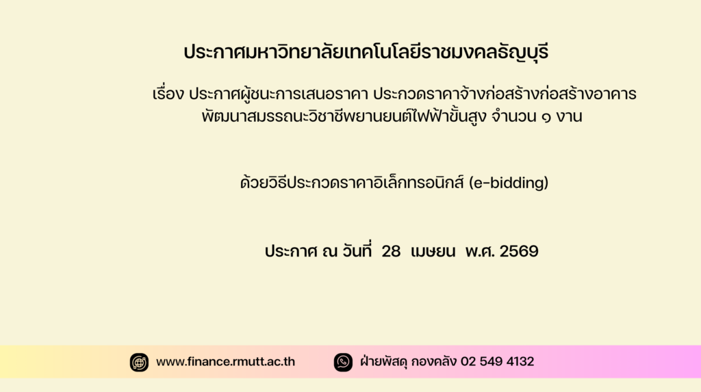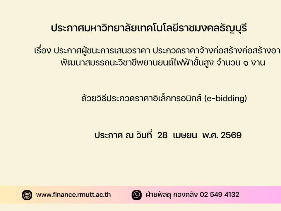 ๓. ผู้สนใจสามารถดูรายละเอียดและดาวน์โหลดเอกสารประกวดราคาอิเล็กทรอนิกส์เลขที่ งรด.๗(จ)/๒๕๖๙ ลงวันที่ ๒๔ กุมภาพันธ์ พ.ศ. ๒๕๖๙ ทางระบบจัดซื้อจัดจ้างภาครัฐด้วยอิเล็กทรอนิกส์ ได้ตั้งแต่วันที่ประกาศจนถึงวันเสนอราคา ได้ที่เว็บไซต์ www.finance.rmutt.ac.th หรือwww.gprocurement.go.th ทั้งนี้ หากต้องการทราบรายละเอียดเพิ่มเติมเกี่ยวกับแบบรูปและรายการละเอียด โปรดสอบถามมายัง มหาวิทยาลัยเทคโนโลยีราชมงคลธัญบุรี ผ่านทางไปรษณีย์อิเล็กทรอนิกส์ finance@mail.rmutt.ac.thหรือช่องทางตามที่กรมบัญชีกลางกำหนด ภายในวันที่ ๒๗ กุมภาพันธ์ ๒๕๖๙ ในเวลาราชการโดยมหาวิทยาลัยเทคโนโลยีและ www.gprocurement.go.th ในวันที่ ๒๗ กุมภาพันธ์ ๒๕๖๙