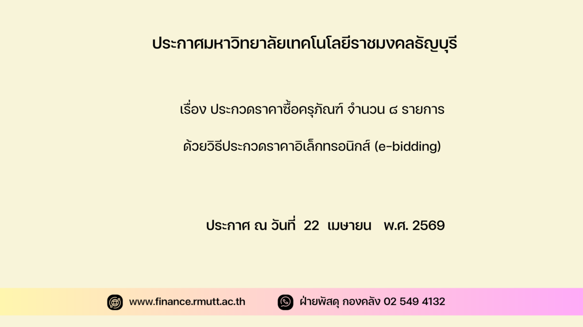 ๓. ผู้สนใจสามารถดูรายละเอียดและดาวน์โหลดเอกสารประกวดราคาอิเล็กทรอนิกส์เลขที่ง ปม.๒๗/๒๕๖๙ ลงวันที่ ๒๒ เมษายน พ.ศ. ๒๕๖๙ ผ่านทางระบบจัดซื้อจัดจ้างภาครัฐด้วยอิเล็กทรอนิกส์ ได้ตั้งแต่วันที่ประกาศจนถึงวันเสนอราคา ได้ที่เว็บไซต์ www.finance.rmutt.ac.thหรือwww.gprocurement.go.th ทั้งนี้ หากต้องการทราบรายละเอียดเพิ่มเติมเกี่ยวกับรายละเอียดคุณลักษณะเฉพาะ โปรดสอบถามมายัง มหาวิทยาลัยเทคโนโลยีราชมงคลธัญบุรี ผ่านทางไปรษณีย์อิเล็กทรอนิกส์ finance@mail.rmutt.ac.th หรือช่องทางตามที่กรมบัญชีกลางกำหนด ภายในวันที่ ๒๓ เมษายน ๒๕๖๙