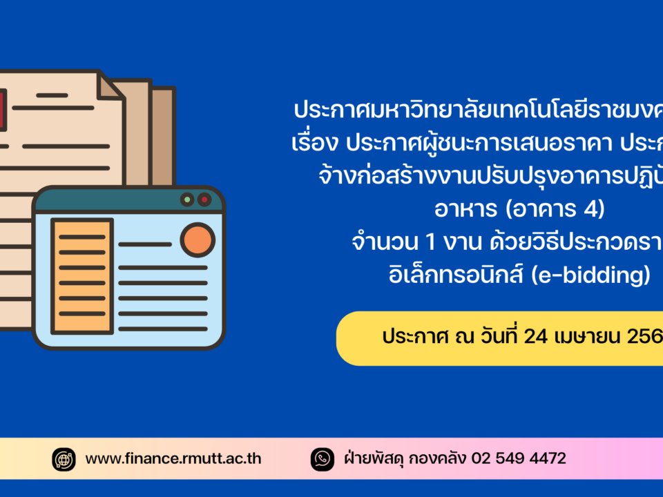 ๓. ผู้สนใจสามารถดูรายละเอียดและดาวน์โหลดเอกสารประกวดราคาอิเล็กทรอนิกส์เลขที่ ลงวันที่ เมษายน พ.ศ. ๒๕๖๙ ผ่านทางระบบจัดซื้อจัดจ้างภาครัฐด้วยอิเล็กทรอนิกส์ ได้ตั้งแต่วันที่ประกาศจนถึงวันเสนอราคา ได้ที่เว็บไซต์ www.finance.rmutt.ac.th หรือ www.gprocurement.go.th
