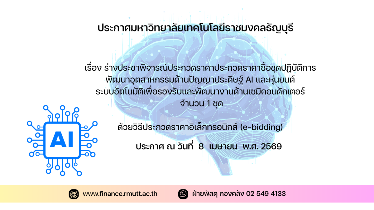 มหาวิทยาลัยเทคโนโลยีราชมงคลธัญบุรี มีความประสงค์จะประกวดราคาซื้อชุดปฏิบัติการพัฒนาอุตสาหกรรมด้านปัญญาประดิษฐ์ AI และหุ่นยนต์ระบบอัตโนมัติเพื่อรองรับและพัฒนางานด้านเซมิคอนดักเตอร์ จำนวน ๑ ชุด ด้วย วิธีประกวดราคาอิเล็กทรอนิกส์ (e-bidding) ราคากลางของงานซื้อ ในการประกวดราคาครั้งนี้