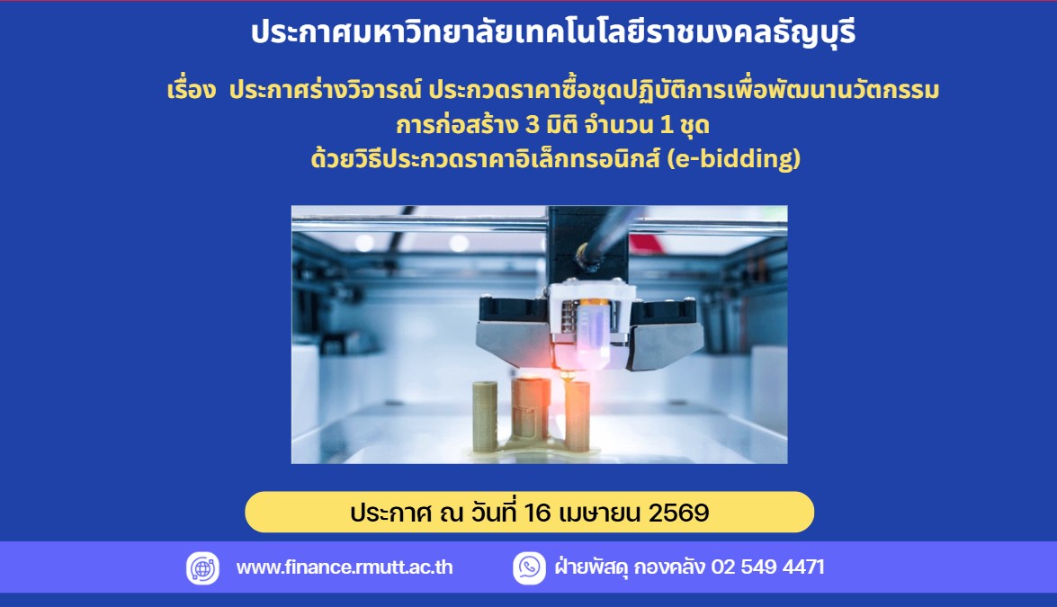 มหาวิทยาลัยเทคโนโลยีราชมงคลธัญบุรี มีความประสงค์จะประกวดราคาซื้อชุดปฏิบัติการเพื่อพัฒนานวัตกรรมการก่อสร้าง ๓ มิติ จำนวน ๑ ชุด ด้วยวิธีประกวดราคาอิเล็กทรอนิกส์ (e-bidding) ราคากลางของงานซื้อ ในการประกวดราคาครั้งนี้ เป็นเงินทั้งสิ้น ๘,๐๓๓,๑๐๐.๐๐ บาท (แปดล้านสามหมื่นสามพันหนึ่งร้อยบาทถ้วน) จำนวน ๑ รายการ