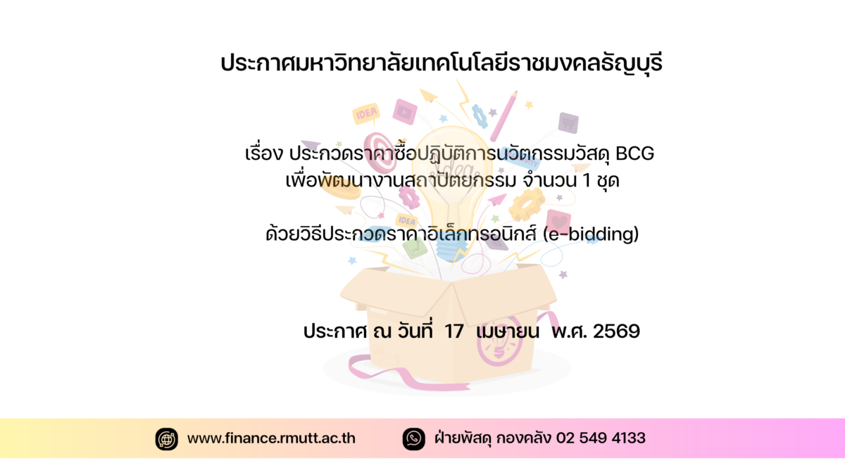 มหาวิทยาลัยเทคโนโลยีราชมงคลธัญบุรี มีความประสงค์จะประกวดราคาซื้อชุดปฏิบัติการนวัตกรรมวัสดุ BCG เพื่อพัฒนางานสถาปัตยกรรม จำนวน ๑ ชุด ด้วยวิธีประกวดราคาอิเล็กทรอนิกส์ (e-bidding) ราคากลางของงานซื้อ ในการประกวดราคาครั้งนี้ เป็นเงินทั้งสิ้น ๕,๙๐๐,๐๐๐.๐๐ บาท (ห้าล้านเก้าแสนบาทถ้วน)