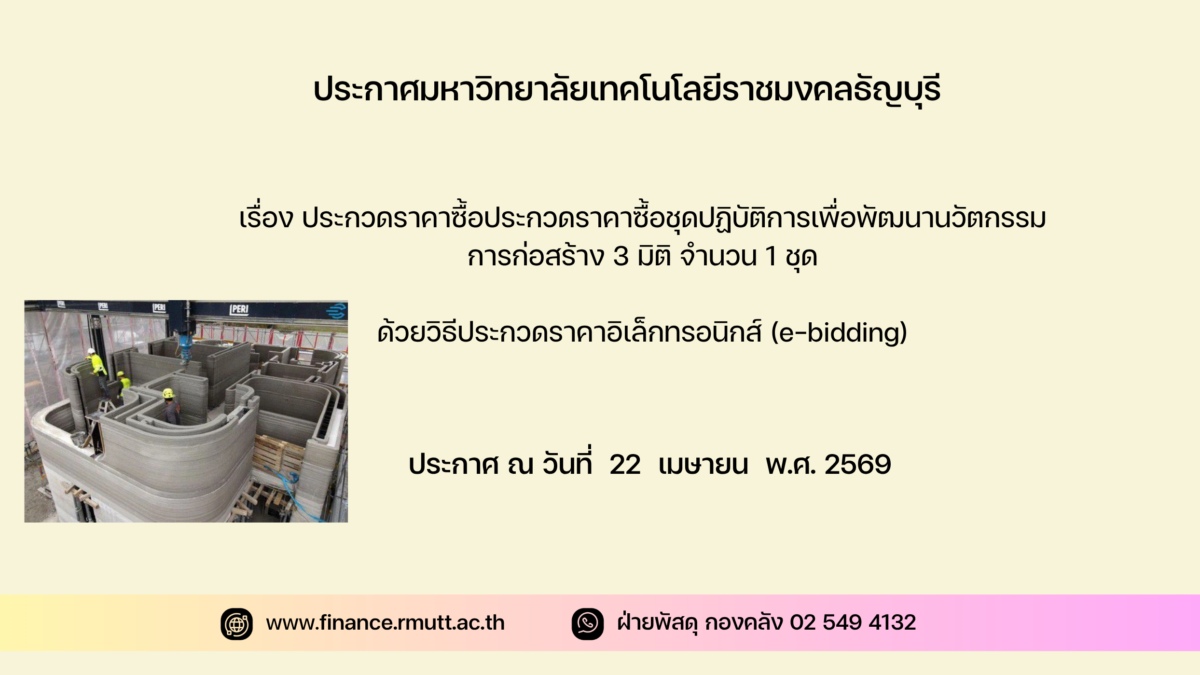 มหาวิทยาลัยเทคโนโลยีราชมงคลธัญบุรี มีความประสงค์จะประกวดราคาซื้อชุดปฏิบัติการเพื่อพัฒนานวัตกรรมการก่อสร้าง ๓ มิติ จำนวน ๑ ชุด ด้วยวิธีประกวดราคาอิเล็กทรอนิกส์ (e-bidding) ราคากลางของงานซื้อ ในการประกวดราคาครั้งนี้ เป็นเงินทั้งสิ้น ๘,๐๓๓,๑๐๐.๐๐ บาท (แปดล้านสามหมื่นสามพันหนึ่งร้อยบาทถ้วน) จำนวน ๑ รายการ