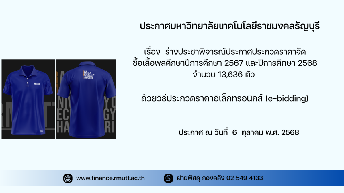 มหาวิทยาลัยเทคโนโลยีราชมงคลธัญบุรี มีความประสงค์จะประกวดราคาซื้อเสื้อพลศึกษา ปีการศึกษา ๒๕๖๗ และปีการศึกษา ๒๕๖๘ จำนวน ๑๓,๖๓๖ ตัว ด้วยวิธีประกวดราคาอิเล็กทรอนิกส์ (e-bidding) ราคากลางของงานซื้อ ในการประกวดราคาครั้งนี้ เป็นเงินทั้งสิ้น ๓,๖๑๓,๕๔๐.๐๐ บาท (สามล้าน หกแสนหนึ่งหมื่นสามพันห้าร้อยสี่สิบบาทถ้วน) จำนวน ๑ รายการ