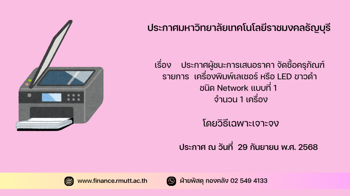 ตามที่ มหาวิทยาลัยเทคโนโลยีราชมงคลธัญบุรี ได้มีโครงการ ซื้อเครื่องพิมพ์เลเซอร์ หรือ LED ขาวดำ ชนิด Network แบบที่ 1 จำนวน 1 เครื่อง โดยวิธีเฉพาะเจาะจง นั้น