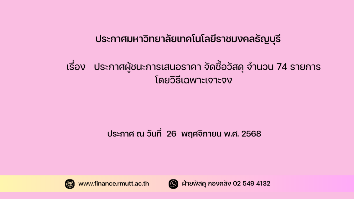 ตามที่ มหาวิทยาลัยเทคโนโลยีราชมงคลธัญบุรี ได้มีโครงการจัดซื้อรายงานการขออนุมัติจัดซื้อวัสดุ จำนวน 74 รายการ โดยวิธีเฉพาะเจาะจง นั้น