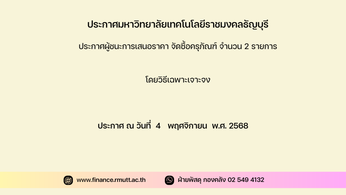 ตามที่ มหาวิทยาลัยเทคโนโลยีราชมงคลธัญบุรี ได้มีโครงการ จัดซื้อครุภัณฑ์ จำนวน 2 รายการ โดยวิธีเฉพาะเจาะจง รายการดังต่อไปนี้