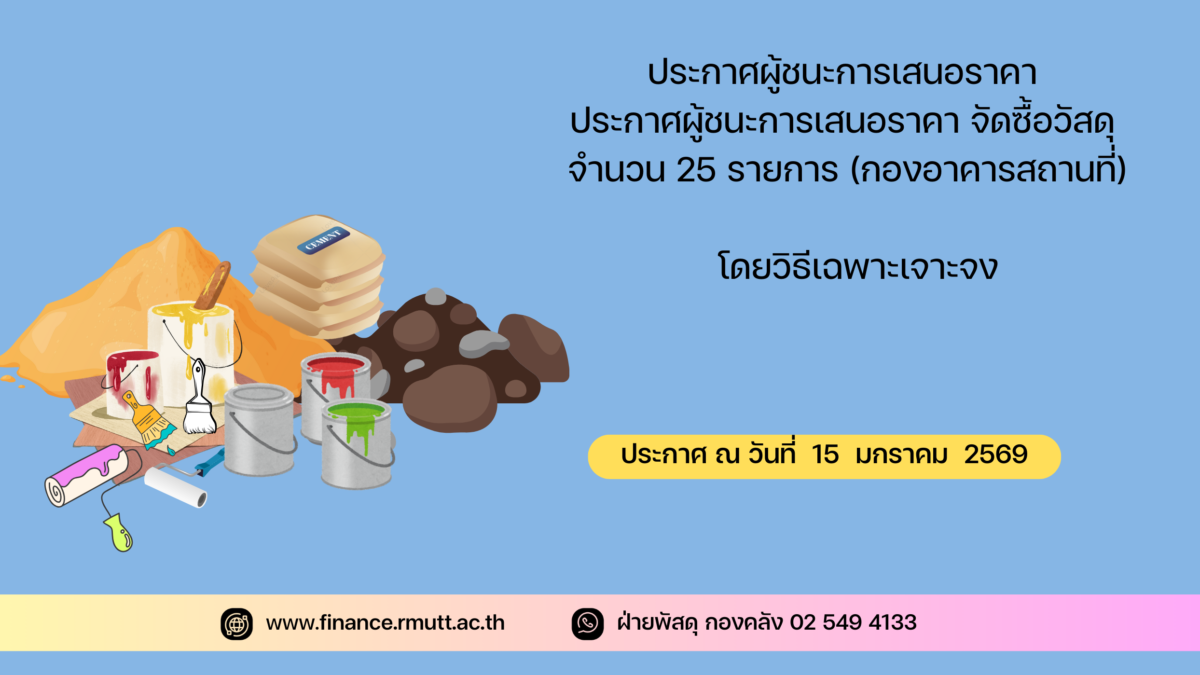 ตามที่ มหาวิทยาลัยเทคโนโลยีราชมงคลธัญบุรี ได้มีโครงการจัดซื้อวัสดุ จำนวน 25 รายการ โดยวิธีเฉพาะเจาะจง นั้น