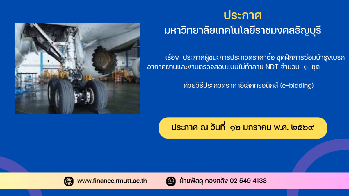 ตามประกาศ มหาวิทยาลัยเทคโนโลยีราชมงคลธัญบุรี เรื่อง ประกวดราคาซื้อ ชุดฝึกการซ่อมบำรุงเบรกอากาศยานและงานตรวจสอบแบบไม่ทำลาย NDT จำนวน ๑ ชุด ด้วยวิธีประกวดราคาอิเล็กทรอนิกส์ (e-bidding)