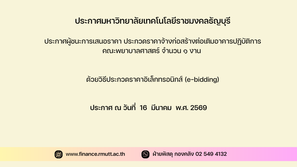 ตามประกาศ มหาวิทยาลัยเทคโนโลยีราชมงคลธัญบุรี เรื่อง ประกวดราคาจ้างก่อสร้างต่อเติมอาคารปฏิบัติการคณะพยาบาลศาสตร์ จำนวน ๑ งาน ด้วยวิธีประกวดราคาอิเล็กทรอนิกส์ (e-bidding)