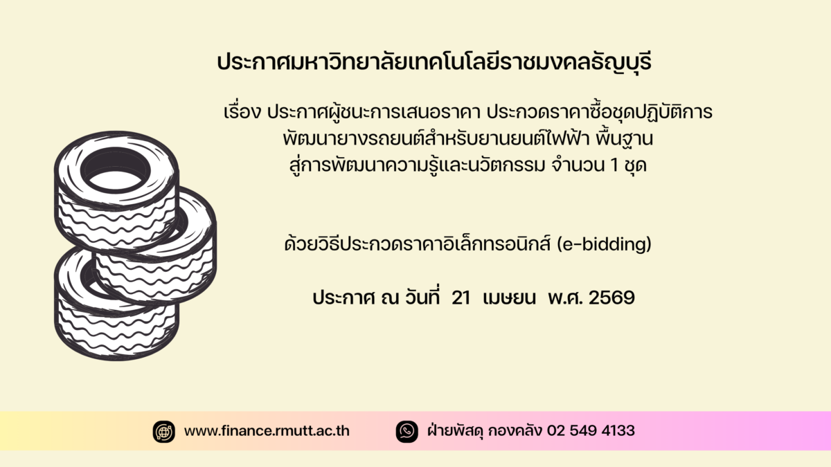 ตามประกาศ มหาวิทยาลัยเทคโนโลยีราชมงคลธัญบุรี เรื่อง ประกวดราคาซื้อชุดปฏิบัติการพัฒนายางรถยนต์สำหรับยานยนต์ไฟฟ้า พื้นฐานสู่การพัฒนาความรู้และนวัตกรรม จำนวน ๑ ชุด ด้วยวิธีประกวดราคาอิเล็กทรอนิกส์