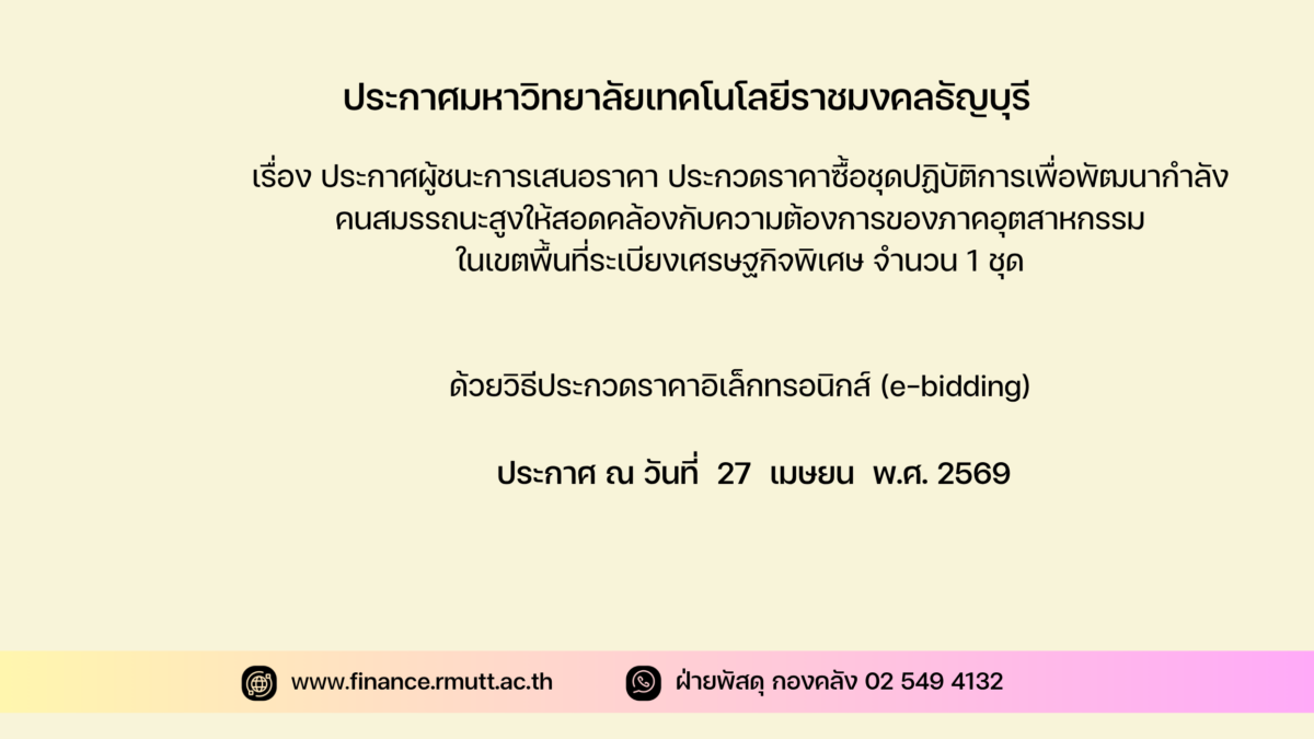 ตามประกาศ มหาวิทยาลัยเทคโนโลยีราชมงคลธัญบุรี เรื่อง ประกวดราคาซื้อชุดปฏิบัติการเพื่อพัฒนากำลังคนสมรรถนะสูงให้สอดคล้องกับความต้องการของภาคอุตสาหกรรมในเขตพื้นที่ระเบียงเศรษฐกิจพิเศษ จำนวน ๑ ชุด
