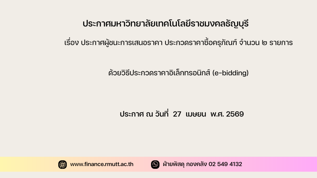 ตามประกาศ มหาวิทยาลัยเทคโนโลยีราชมงคลธัญบุรี เรื่อง ประกวดราคาซื้อครุภัณฑ์ จำนวน ๒ รายการ ด้วยวิธีประกวดราคาอิเล็กทรอนิกส์ (e-bidding) และเอกสารประกวดราคาด้วยวิธีประกวดราคาอิเล็กทรอนิกส์ (e-bidding) เลขที่ งปม.๒๖/๒๕๖๙ ลงวันที่ ๒๐ เมษายน ๒๕๖๙ นั้น
