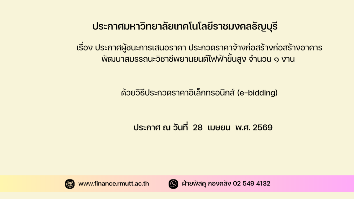ตามประกาศ มหาวิทยาลัยเทคโนโลยีราชมงคลธัญบุรี เรื่อง ประกวดราคาจ้างก่อสร้างก่อสร้างอาคารพัฒนาสมรรถนะวิชาชีพยานยนต์ไฟฟ้าขั้นสูง จำนวน ๑ งาน ด้วยวิธีประกวดราคาอิเล็กทรอนิกส์