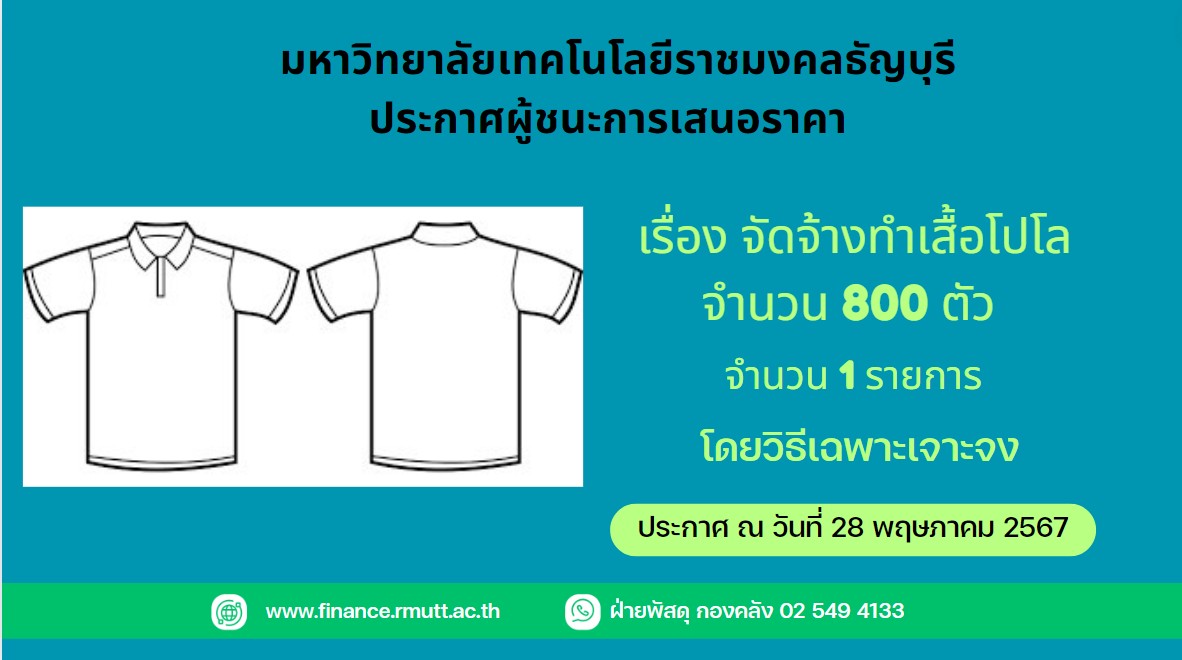 ตามที่ มหาวิทยาลัยเทคโนโลยีราชมงคลธัญบุรี ได้มีโครงการ จัดจ้างทำเสื้อโปโล จำนวน 800 ตัว ของงานพัสดุ โดยวิธีเฉพาะเจาะจง นั้น