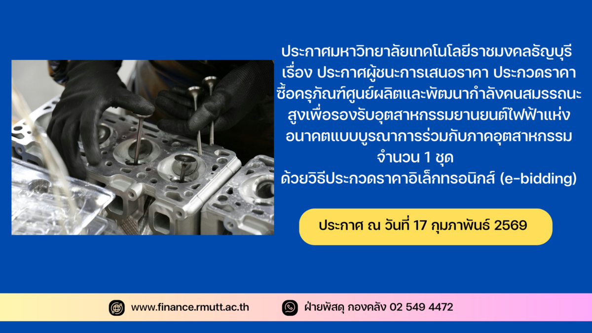 ประกาศมหาวิทยาลัยเทคโนโลยีราชมงคลธัญบุรี เรื่อง ประกาศผู้ชนะการเสนอราคา ประกวดราคาซื้อครุภัณฑ์ศูนย์ผลิตและพัฒนากำลังคนสมรรถนะสูงเพื่อรองรับอุตสาหกรรมยานยนต์ไฟฟ้าแห่งอนาคตแบบบูรณาการร่วมกับภาคอุตสาหกรรมจำนวน 1 ชุด ด้วยวิธีประกวดราคาอิเล็กทรอนิกส์ (e-bidding)