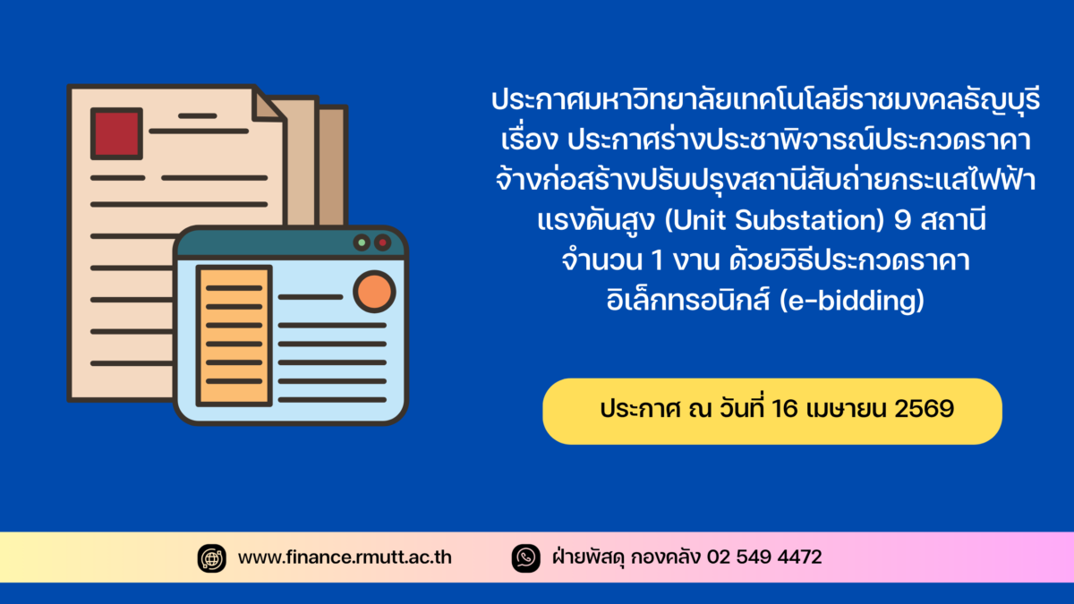 ประกาศมหาวิทยาลัยเทคโนโลยีราชมงคลธัญบุรี เรื่อง ประกาศร่างประชาพิจารณ์ประกวดราคาจ้างก่อสร้างปรับปรุงสถานีสับถ่ายกระแสไฟฟ้าแรงดันสูง (Unit Substation)