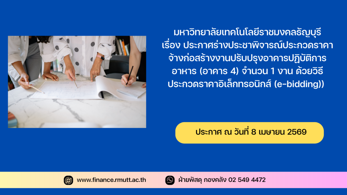 ประกาศร่างประชาพิจารณ์ประกวดราคาจ้างก่อสร้างงานปรับปรุงอาคารปฏิบัติการอาหาร (อาคาร 4) จำนวน 1 งาน ด้วยวิธีประกวดราคาอิเล็กทรอนิกส์ (e-bidding)