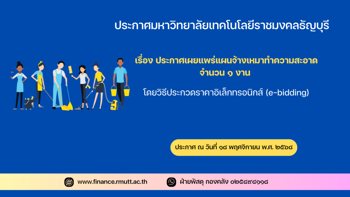 ประกาศเผยแพร่แผนการจัดซื้อจัดจ้าง ประจำปีงบประมาณ พ.ศ. ๒๕๖๙ รายการ จ้างเหมาทำความสะอาด จำนวน 1 งาน ด้วยวิธีประกวดราคาอิเล็กทรอนิกส์ (e-bidding)