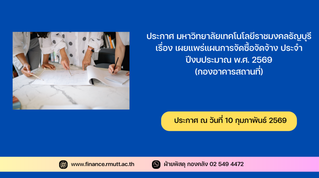 กองคลัง มหาวิทยาลัยเทคโนโลยีราชมงคลธัญบุรี ขอประกาศเผยแพร่แผนการจัดซื้อจัดจ้าง ประจำปีงบประมาณ พ.ศ ๒๕๖๙ ตามเอกสารที่แนบท้ายประกาศนี้