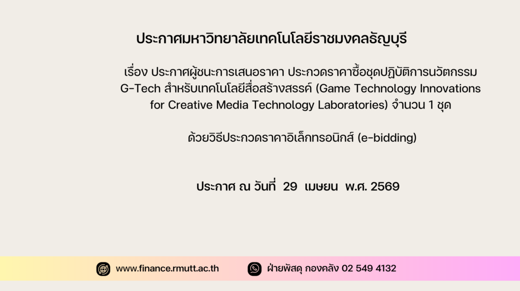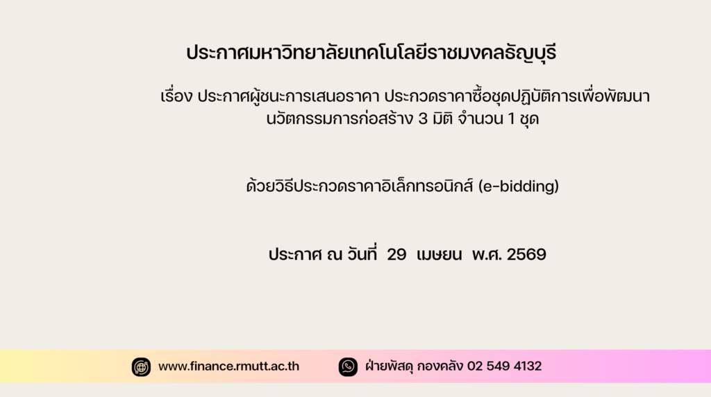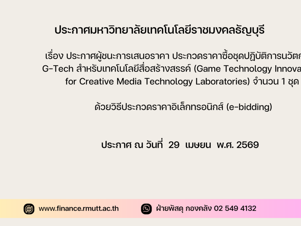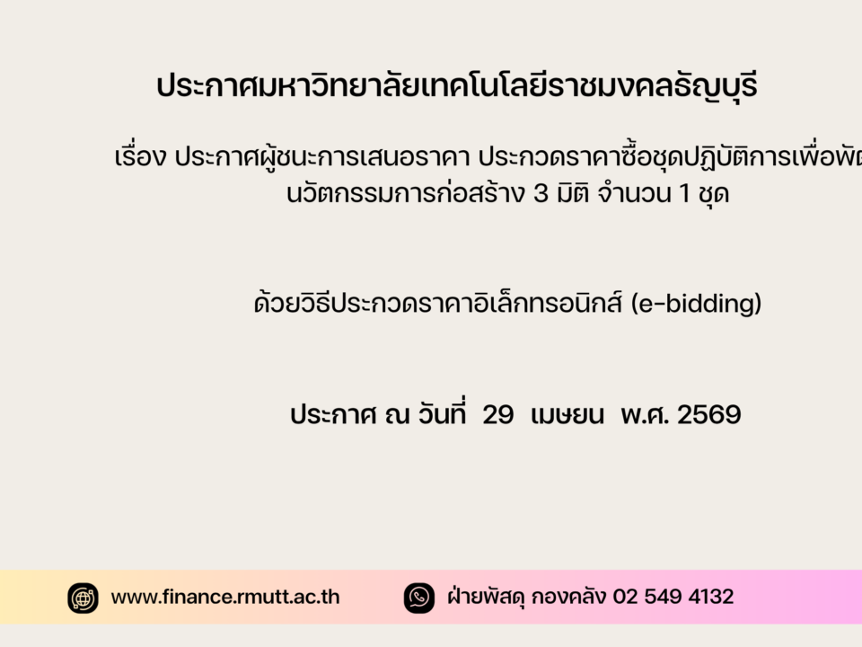 ประกาศ มหาวิทยาลัยเทคโนโลยีราชมงคลธัญบุรี เรื่อง ยกเลิกประกาศ ประกวดราคาซื้อชุดฝึกปฏิบัติการเพื่อสร้างนวัตกรรมและทักษะการเรียนรู้ด้านเทคโนโลยีจักรวาลนฤมิต (Metaverse) เทคโนโลยีปัญญาประดิษฐ์ (Artificial Intelligence) และความเป็นผู้ประกอบการ (Entrepreneur) จำนวน 1 ชุด ด้วยวิธีประกวดราคาอิเล็กทรอนิกส์ (e-bidding)
