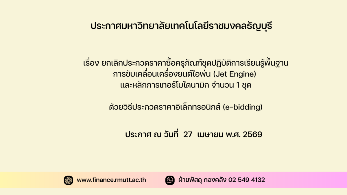 ยกเลิกประกวดราคาซื้อครุภัณฑ์ชุดปฏิบัติการเรียนรู้พื้นฐานการขับเคลื่อนเครื่องยนต์ไอพ่น (Jet Engine) และหลักการเทอร์โมไดนามิก จำนวน 1 ชุด ด้วยวิธีประกวดราคาอิเล็กทรอนิกส์ (e-bidding)