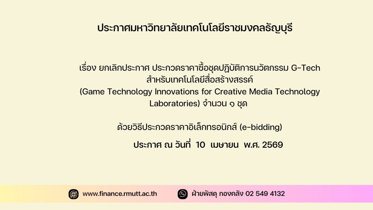 ตามประกาศมหาวิทยาลัยเทคโนโลยีราชมงคลธัญบุรี เรื่อง ประกวดราคาซื้อชุดปฏิบัติการนวัตกรรม G-Tech สำหรับเทคโนโลยีสื่อสร้างสรรค์ (Game Technology Innovations for Creative Media Technology Laboratories) จำนวน ๑ ชุด ด้วยวิธีประกวดราคาอิเล็กทรอนิกส์ (e-bidding) และเอกสารประกวดราคาซื้อด้วยวิธีประกวดราคาอิเล็กทรอนิกส์ (e-Bidding) เลขที่ งปม.๑๒/๒๕๖๙