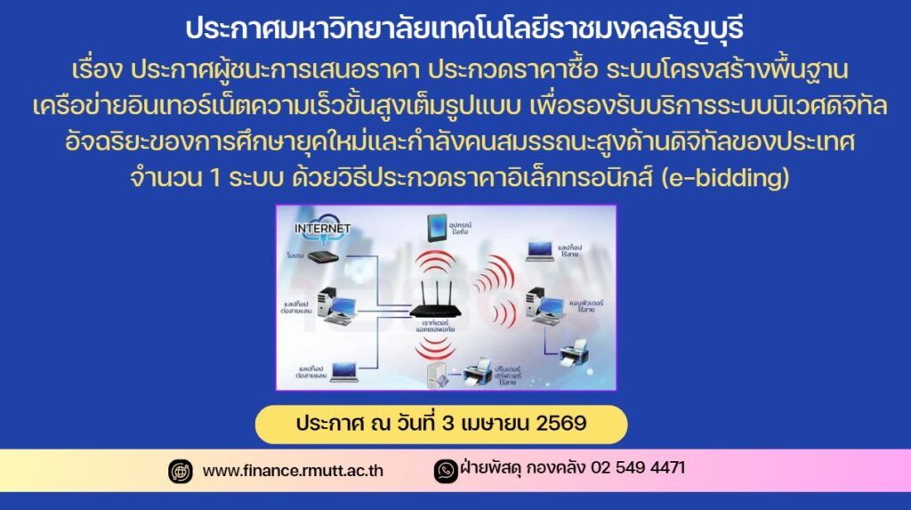 ตามประกาศ มหาวิทยาลัยเทคโนโลยีราชมงคลธัญบุรี เรื่อง ระบบโครงสร้างพื้นฐานเครือข่ายอินเทอร์เน็ตความเร็วขั้นสูงเต็มรูปแบบ เพื่อรองรับบริการระบบนิเวศดิจิทัลอัจฉริยะของการศึกษายุคใหม่และกำลังคนสมรรถนะสูงด้านดิจิทัลของประเทศ จำนวน 1 ระบบ ด้วยวิธีประกวดราคาอิเล็กทรอนิกส์ (e-bidding) และเอกสารประกวดราคาด้วยวิธีประกวดราคาอิเล็กทรอนิกส์ (e-bidding) เลขที่ งรด.4/2569 ลงวันที่ 20กุมภาพันธ์ 2569 นั้น