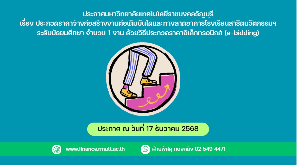 3. ผู้สนใจสามารถดูรายละเอียดและดาวน์โหลดเอกสารประกวดราคาอิเล็กทรอนิกส์เลขที่ ลงวันที่ ธันวาคม พ.ศ. 2568 ผ่านทางระบบจัดซื้อจัดจ้างภาครัฐด้วยอิเล็กทรอนิกส์ ได้ตั้งแต่วันที่ประกาศจนถึงวันเสนอราคา ได้ที่เว็บไซต์ www.finance.rmutt.ac.th หรือ www.gprocurement.go.th ทั้งนี้ หากต้องการทราบรายละเอียดเพิ่มเติมเกี่ยวกับแบบรูปและรายการละเอียด โปรดสอบถามมายัง มหาวิทยาลัยเทคโนโลยีราชมงคลธัญบุรี ผ่านทางไปรษณีย์อิเล็กทรอนิกส์ finance@mail.rmutt.ac.th หรือช่องทางตามที่กรมบัญชีกลางกําหนด ภายในวันที่ ในเวลาราชการ โดย มหาวิทยาลัยเทคโนโลยีราชมงคลธัญบุรี จะชี้แจงรายละเอียดดังกล่าวผ่านทางเว็บไซต์ www.finance.rmutt.ac.th. และ www gprocurement.go.th ในวันที่