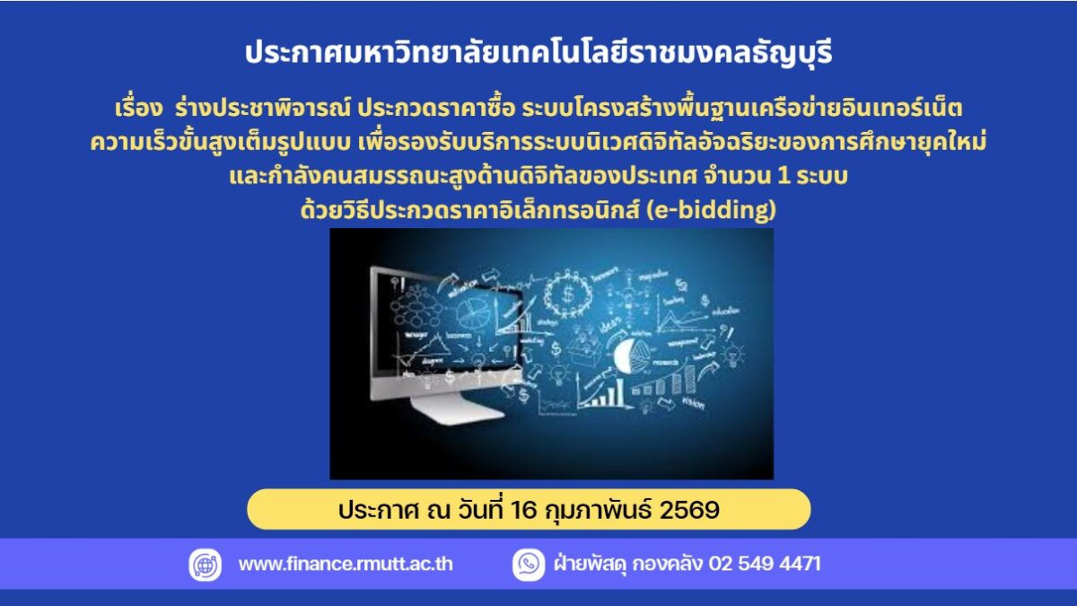 มหาวิทยาลัยเทคโนโลยีราชมงคลธัญบุรี มีความประสงค์จะประกวดราคาซื้อระบบโครงสร้างพื้นฐานเครือข่ายอินเทอร์เน็ตความเร็วขั้นสูงเต็มรูปแบบ เพื่อรองรับบริการระบบนิเวศดิจิทัลอัจฉริยะของการศึกษายุคใหม่และกำลังคนสมรรถนะสูงด้านดิจิทัลของประเทศ จำนวน 1 ระบบ ด้วยวิธีประกวดราคาอิเล็กทรอนิกส์ (e-bidding) ราคากลางของงานซื้อ ในการประกวดราคาครั้งนี้ เป็นเงินทั้งสิ้น 75,000,000.00 บาท (เจ็ดสิบห้าล้านบาทถ้วน) จำนวน 1 รายการ