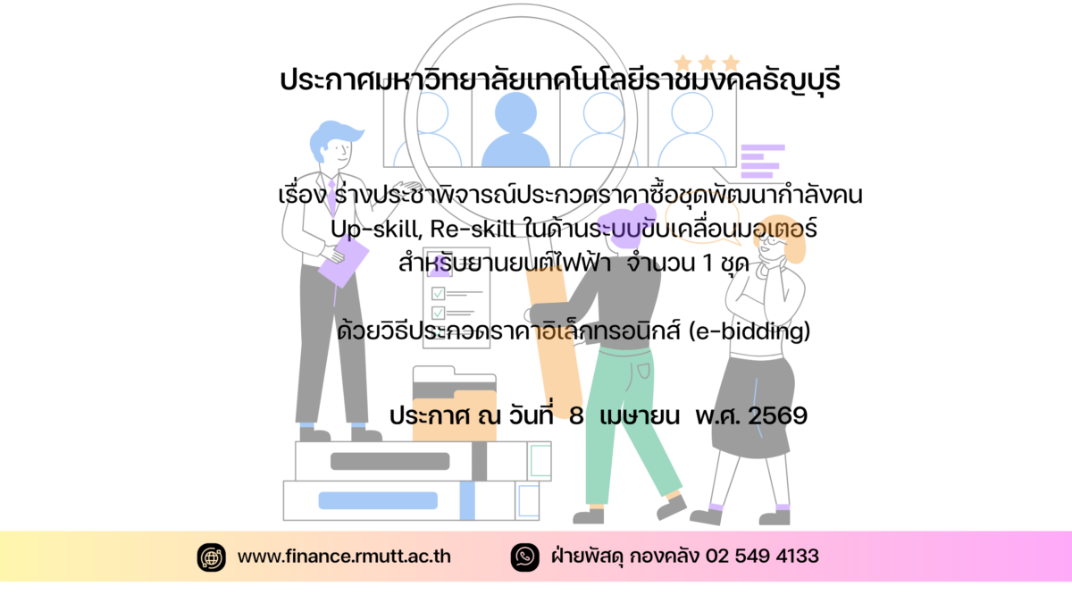 มหาวิทยาลัยเทคโนโลยีราชมงคลธัญบุรี มีความประสงค์จะประกวดราคาซื้อชุดพัฒนากำลังคน Up-skill, Re-skill ในด้านระบบขับเคลื่อนมอเตอร์สำหรับยานยนต์ไฟฟ้า จำนวน ๑ ชุด ด้วยวิธีประกวดราคาอิเล็กทรอนิกส์ (e-bidding) ราคากลางของงานซื้อ ในการประกวดราคาครั้งนี้ เป็นเงินทั้งสิ้น ๑๑,๙๔๐,๐๐๐.๐๐ บาท (สิบเอ็ดล้านเก้าแสนสี่หมื่นบาทถ้วน)