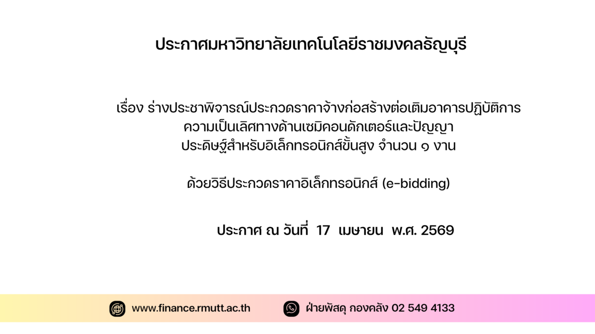 ๓. ผู้สนใจสามารถดูรายละเอียดและดาวน์โหลดเอกสารประกวดราคาอิเล็กทรอนิกส์เลขที่ ลงวันที่ เมษายน พ.ศ. ๒๕๖๙ ผ่านทางระบบจัดซื้อจัดจ้างภาครัฐด้วยอิเล็กทรอนิกส์ ได้ตั้งแต่วันที่ประกาศจนถึงวันเสนอราคา ได้ที่เว็บไซต์ www.finance.rmutt.ac.th หรือwww.gprocurement.go.th ทั้งนี้ หากต้องการทราบรายละเอียดเพิ่มเติมเกี่ยวกับแบบรูปและรายการละเอียด โปรดสอบถามมายัง มหาวิทยาลัยเทคโนโลยีราชมงคลธัญบุรี ผ่านทางไปรษณีย์อิเล็กทรอนิกส์ finance@mail.rmutt.ac.th หรือช่องทางตามที่กรมบัญชีกลางกำหนด ภายในวันที่ ในเวลาราชการ โดยมหาวิทยาลัยเทคโนโลยีและ www.gprocurement.go.th ในวันที่
