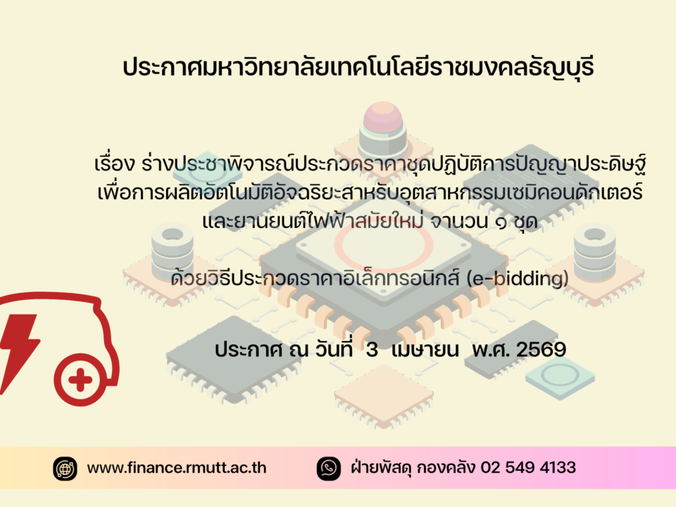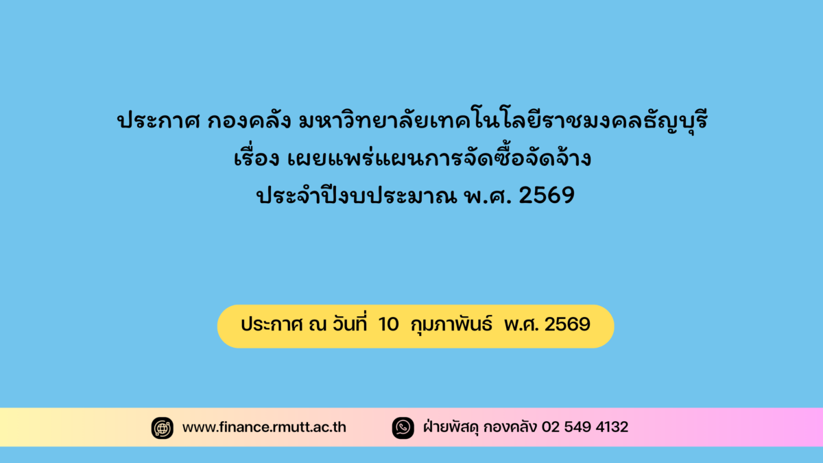 กองคลัง มหาวิทยาลัยเทคโนโลยีราชมงคลธัญบุรี ขอประกาศเผยแพร่แผนการจัดซื้อจัดจ้าง ประจำปีงบประมาณ พ.ศ ๒๕๖๙ ตามเอกสารที่แนบท้ายประกาศนี้