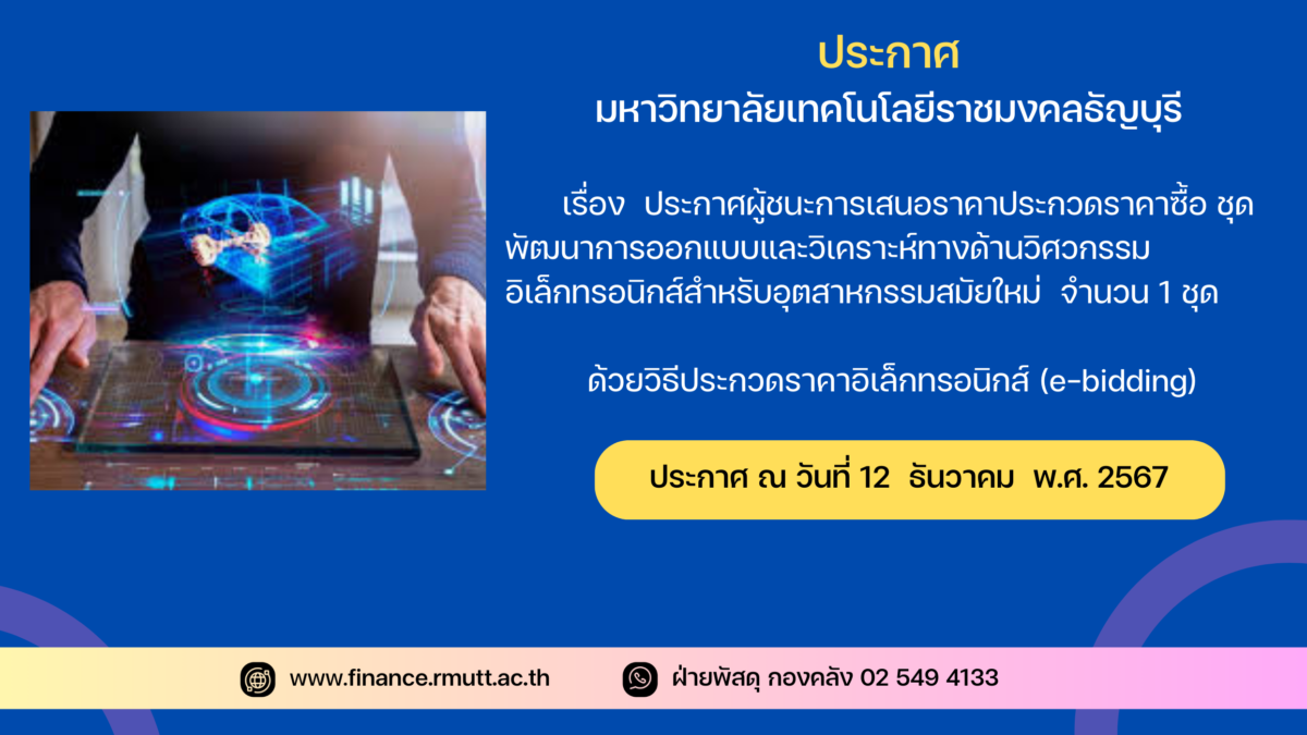 ประกาศผู้ชนะการเสนอราคาประกวดราคาซื้อชุดพัฒนาการออกแบบและวิเคราะห์ทางด้านวิศวกรรมอิเล็กทรอนิกส์สำหรับอุตสาหกรรมสมัยใหม่ จำนวน ๑ ชุด ด้วยวิธีประกวดราคาอิเล็กทรอนิกส์ (e-bidding) (87.8 KiB)