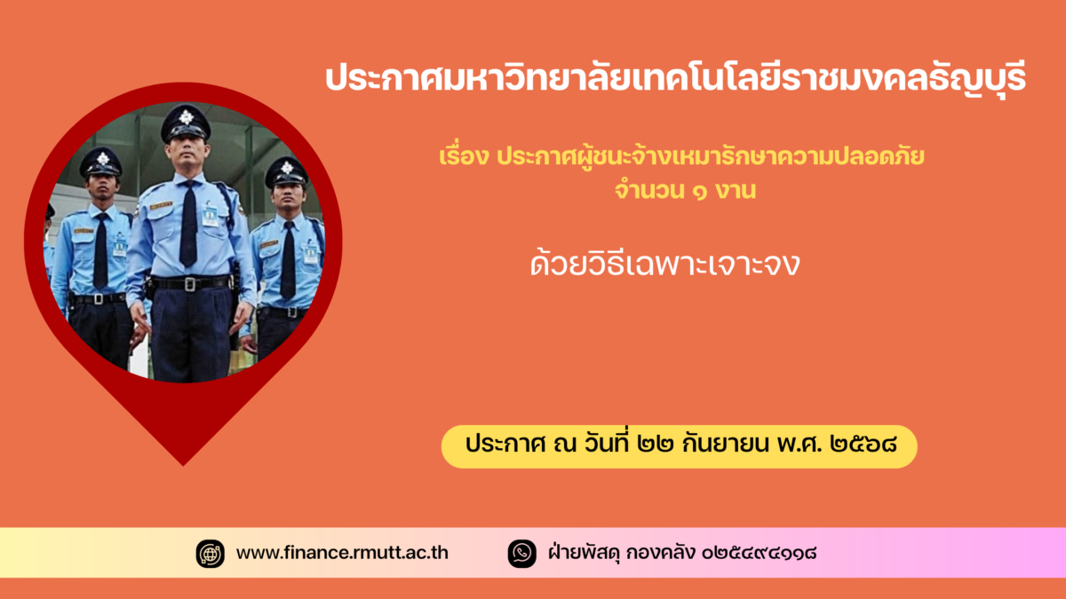ตามที่ มหาวิทยาลัยเทคโนโลยีราชมงคลธัญบุรี ได้มีหนังสือเชิญชวนสำหรับ จ้างเหมาบริการรักษาความปลอดภัย จำนวน ๑ งาน โดยวิธีเฉพาะเจาะจง นั้น