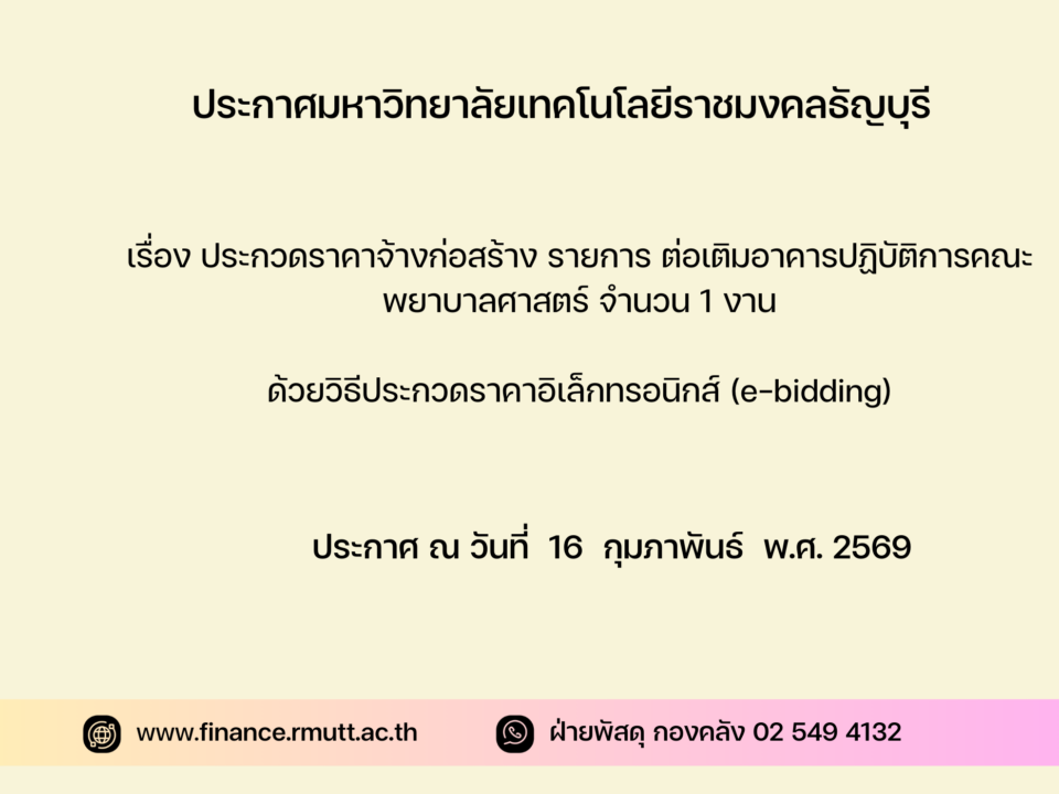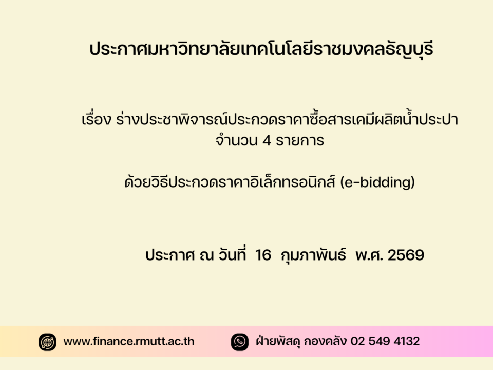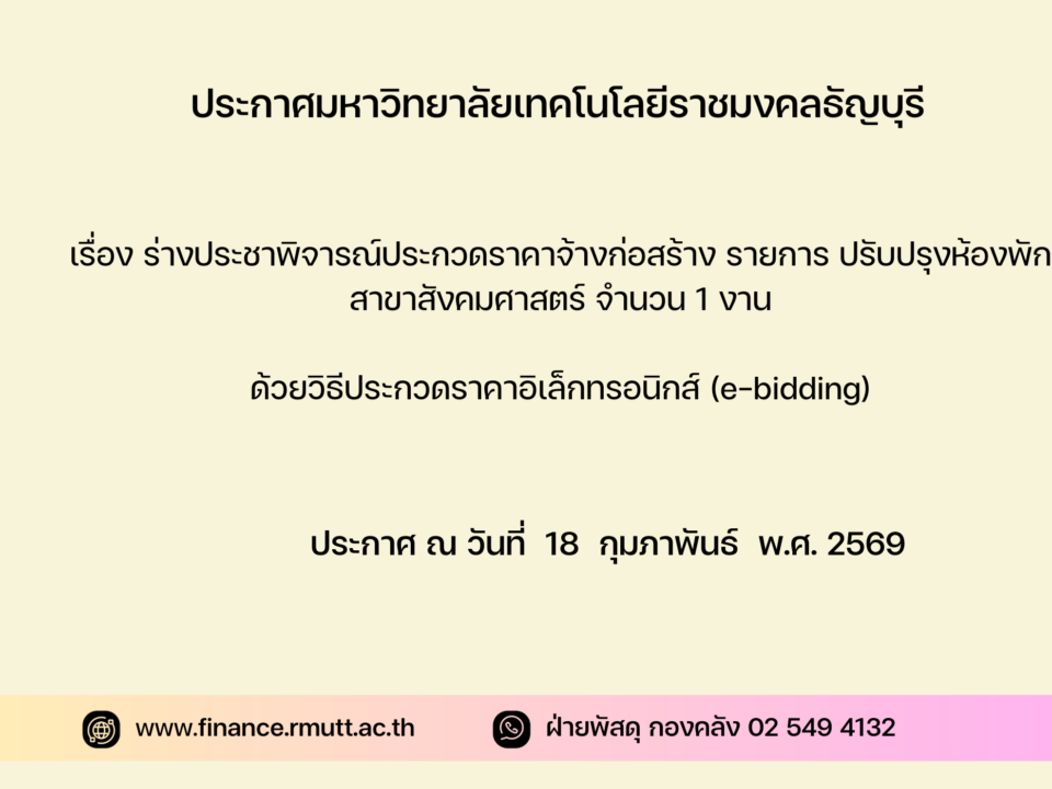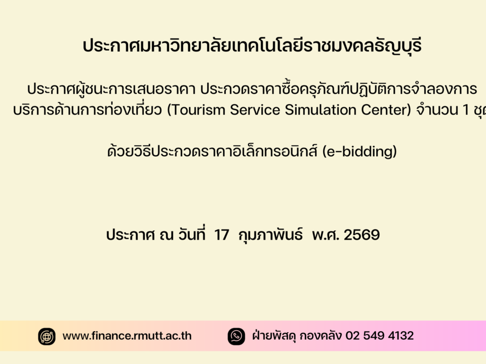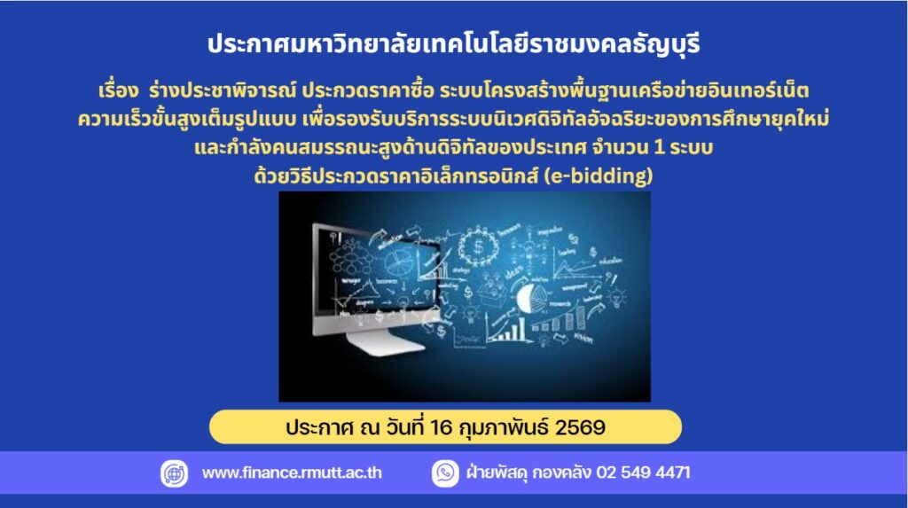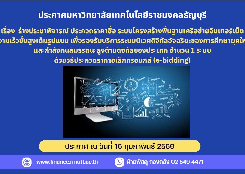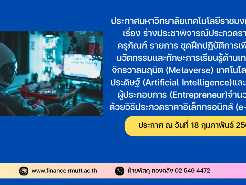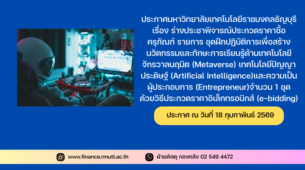 ประกาศมหาวิทยาลัยเทคโนโลยีราชมงคลธัญบุรี เรื่อง ร่างประชาพิจารณ์ประกวดราคาซื้อครุภัณฑ์ รายการ ชุดฝึกปฏิบัติการเพื่อสร้างนวัตกรรมและทักษะการเรียนรู้ด้านเทคโนโลยีจักรวาลนฤมิต (Metaverse) เทคโนโลยีปัญญาประดิษฐ์ (Artificial Intelligence)และความเป็นผู้ประกอบการ (Entrepreneur)จำนวน 1 ชุด ด้วยวิธีประกวดราคาอิเล็กทรอนิกส์ (e-bidding)