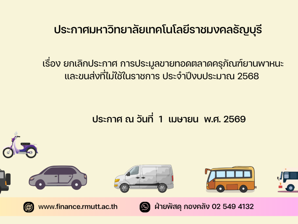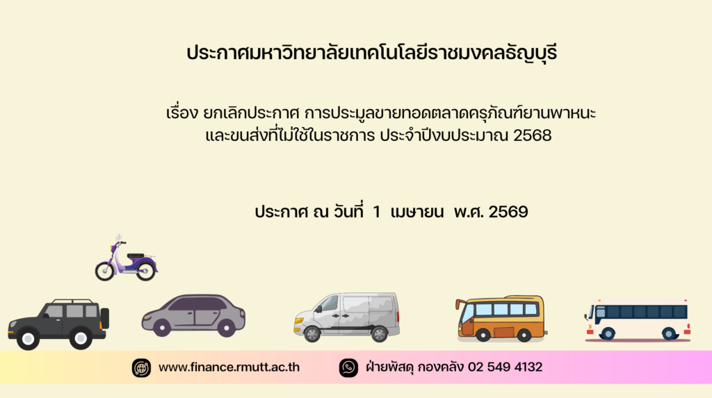 ประกาศมหาวิทยาลัยเทคโนโลยีราชมงคลธัญบุรี เรื่อง ยกเลิกประกาศ การประมูลขายทอดตลาดครุภัณฑ์ยานพาหนะและขนส่งที่ไม่ใช้ในราชการ ประจำปีงบประมาณ 2568