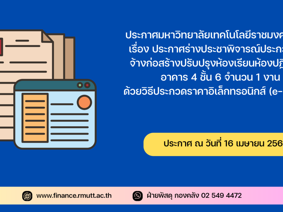 ประกาศมหาวิทยาลัยเทคโนโลยีราชมงคลธัญบุรี เรื่อง ประกาศร่างประชาพิจารณ์ประกวดราคาจ้างก่อสร้างปรับปรุงห้องเรียนห้องปฎิบัติการ อาคาร 4 ชั้น 6 จำนวน 1 งาน ด้วยวิธีประกวดราคาอิเล็กทรอนิกส์ (e-bidding)